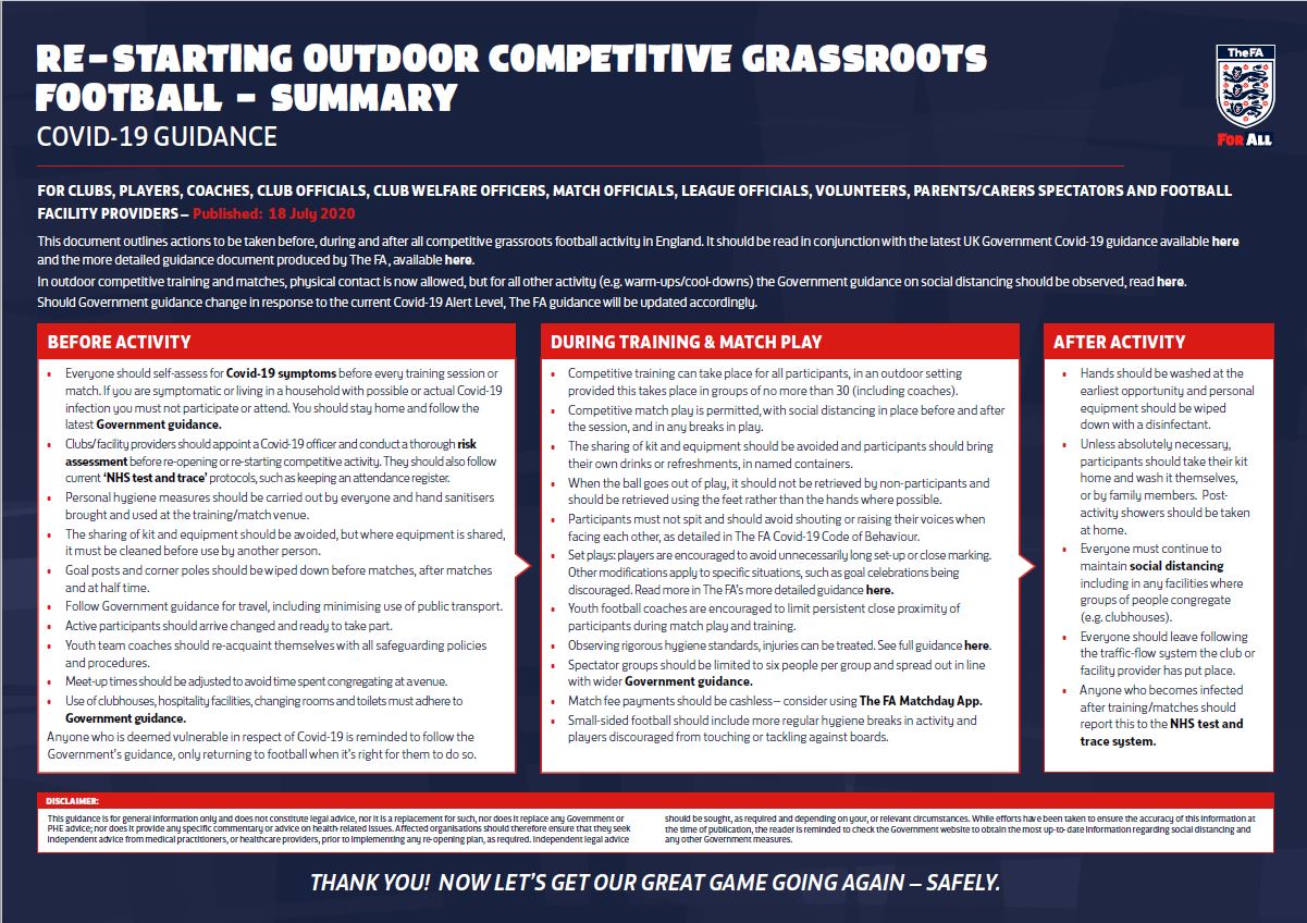 On Friday 12th June 2020 the FA issued a statement ……. “We have today issued new guidance documents for adult players, coaches, facility operators, parents and carers involved in re-starting grassroots football activity during Covid-19.